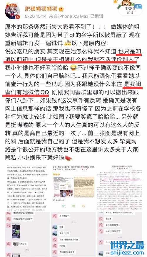 初中同学还晒出一条微博内容,包括她们闺蜜群的聊天记录截图,透露了肖诗雪上学时期的很多迷之行为。