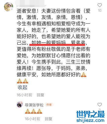 于月仙生前最疼爱,也是最放心不下的人,就是她的母亲和弟弟,张学松称会照顾好于月仙的母亲和弟弟。同时,她也回复一些网友,称他会像于月仙一样爱母亲和弟弟。