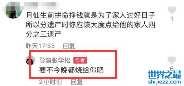 张学松首先否认和于月仙弟弟争财产一说,后来有网友说于月仙生前拼命挣的钱,劝张学松大度一点,把于月仙四分之三的遗产都分给于月仙的家人,张学松非常生气,直接辱骂对方:“要不今晚都烧给你吧”。