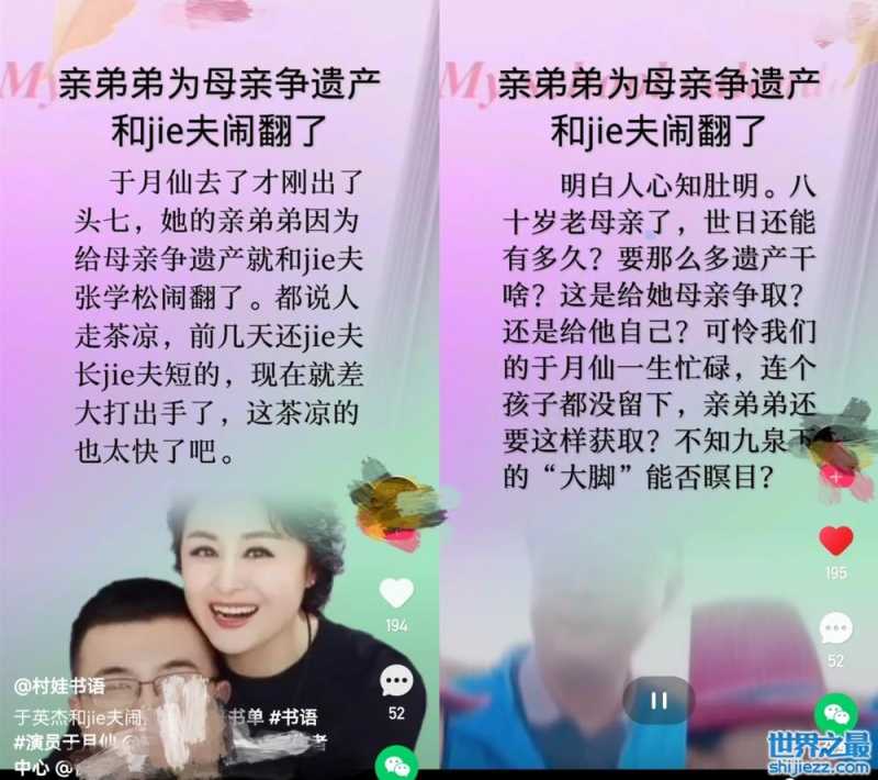 于月仙去世后,关于她的遗产如何处理,也有不少的传言,有一种说法是于月仙母亲和她丈夫一人一份,但有一种非常离谱的传闻,说张学松为了和弟弟于英杰争遗产,二人甚至差点大打出手,越传越离谱。