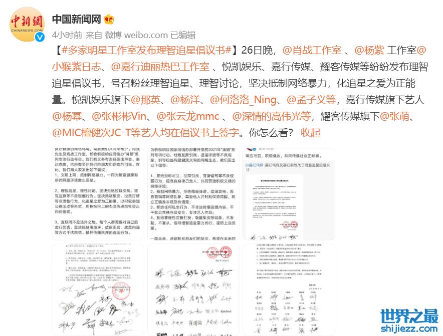 多家明星工作室积极开始回应,发布理智追星倡议书。