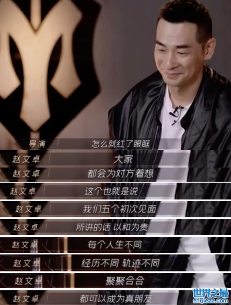 赵文卓听到此话以后哭红了眼眶,他表示自己和组员们本是形同陌路的五个人,初次见面,每个人都有着不同的性格和人生,但是却都能为对方着想,以和为贵,非常难得。