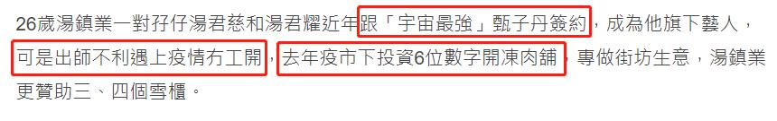 据悉,汤镇业的双胞胎儿子原本签约了甄子丹旗下的公司,但因为不可抗力因素,两人没能成功出道,但两兄弟没有放弃希望,转而投资了百万去做冻肉生意。