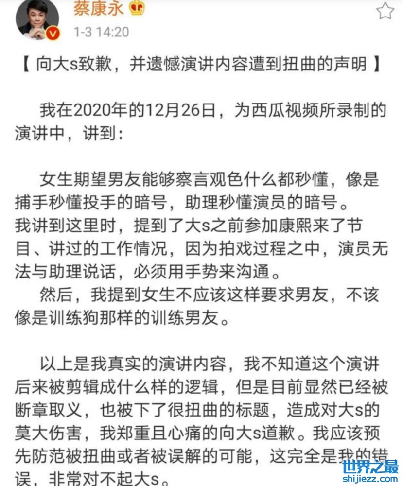果然片段一出,蔡康永马上发微博道歉,大S和助理只是他用来讲述两人有默契的例子,几句话之后才是劝告女孩子们不要把男友当狗训。