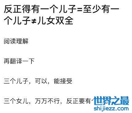 网友还特意做了阅读理解,“反正得有一个儿子=至少有一个儿子≠儿女双全,换言之,三个儿子,可以,能接受,三个女儿,万万不行,反正得有个儿子”。