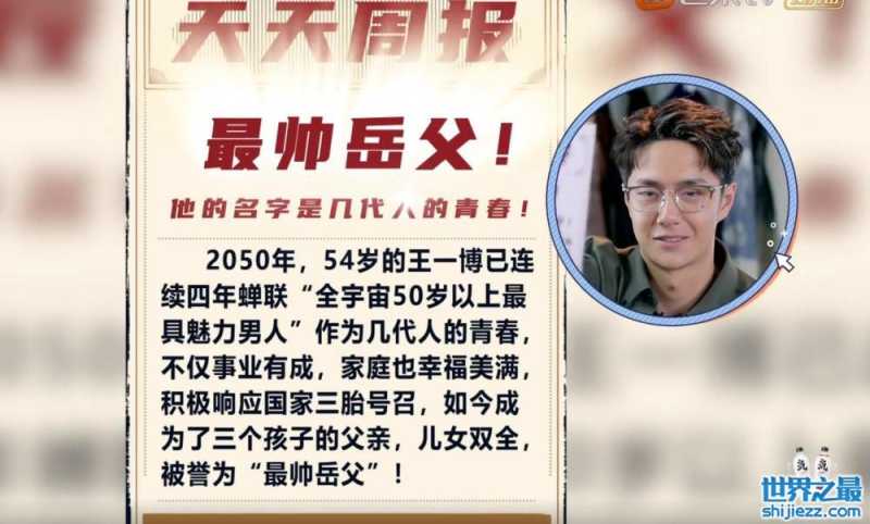 本期《天天向上》三位主持人聊30年后的自己,汪涵,大张伟,王一博化了老年妆。节目组为王一博制作30年后的周报,上面写着:“2050年,54岁的王一博已经蝉联‘全宇宙50岁以上最具魅力的男人’,作为几代人的青春,不仅事业有成,家庭也幸福美满,积极响应国家三胎号召,如今成为了三个孩子的父亲,儿女双全,被誉为‘最帅岳父’”!
