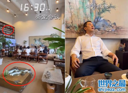 结束完产品会议,李亚鹏又进行茶室会议,具体开会内容不得而知。但茶室环境令人格外惊艳,装修古典显格调,假山假水植物丰富,做旧的低桌上竟然还养了金鱼,真的是繁忙中寻求一份诗意啊。开完茶室会议,李亚鹏口干舌燥一脸疲惫,本想稍作休息却被告知合作方正在等待面谈。