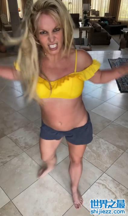 视频中,布兰妮一头金黄色长发,画着烟熏妆,脸蛋红润气色不错,身穿黄色吊带背心,下身搭配深灰色短裤,非常忘我地热舞起来。