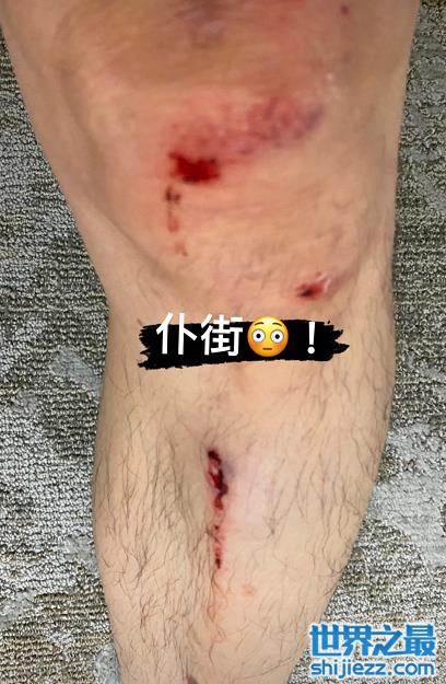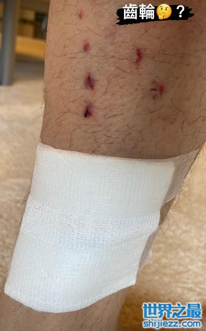 除此之外,哈林的腿上还伴随有骑车摔倒时自行车上的齿轮印,一排排的齿轮印里面也带着淤青和血。