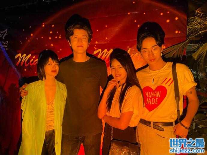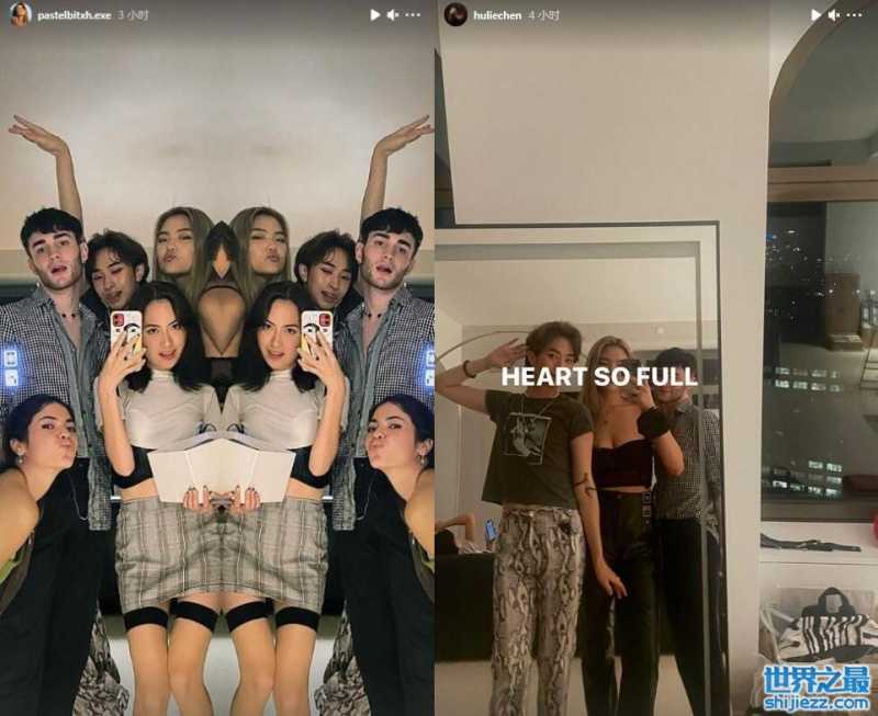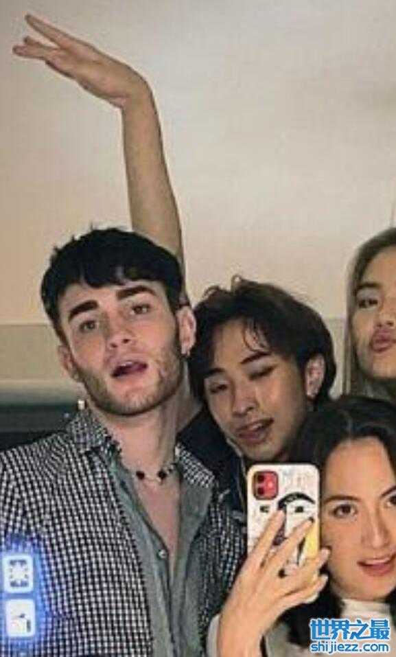 在另一张大合影中,哈利站在后面很会抢镜,吐舌卖萌,眨眼放电,抬起胳膊抢镜。哈利当天还化着烟熏妆,看上去有些油光满面,与好友分离三个月的时间,哈利出国后,第一时间和好友们聚到一起举办趴体。