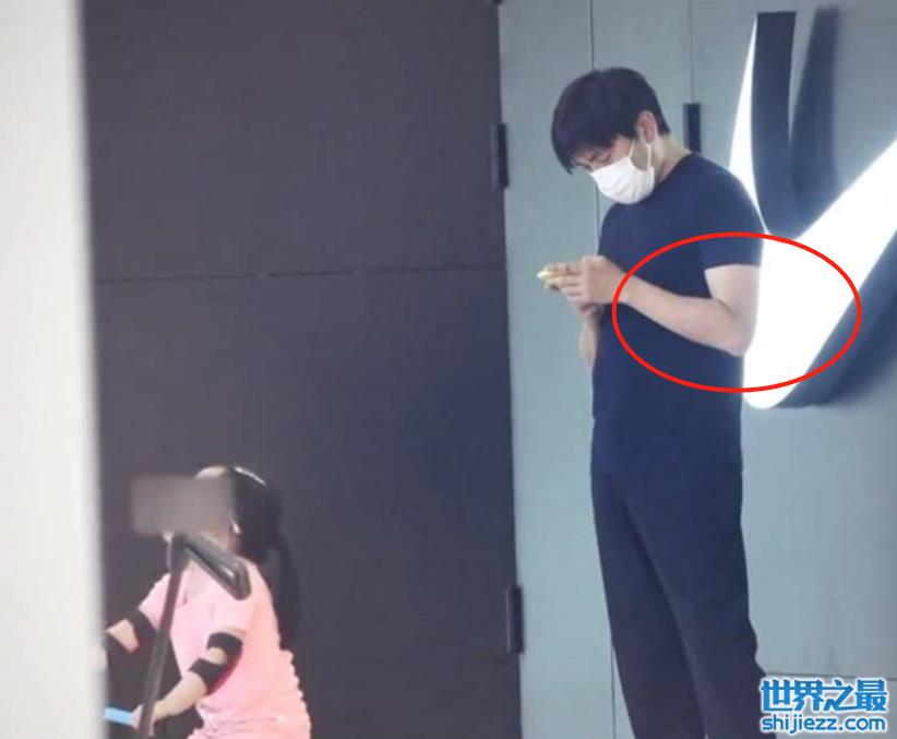 画面中,秦昊身穿黑色T恤,下身搭配同色系长裤,脸上戴着口罩,打扮朴素十分低调。但依旧可以看出秦昊的身材很好,身体壮硕,手臂结实,黑色T恤袖口被绷得紧紧的,站在女儿身边低头玩手机。