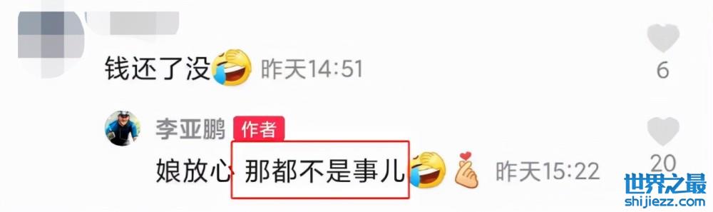 不少吃瓜网友特地去询问他何时才能支付千万欠款,李亚鹏却给了一个令人意外的回复,称那都不算事儿。这样硬气的回复,看来是网友为此白操心了。