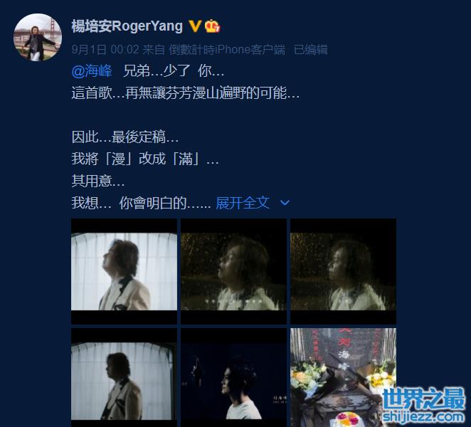 9月1日零点刚过,好友杨培安特意发文缅怀至交,还特意发布了两人此前曾配合创作的音乐MV,杨培文的行文口吻哀伤,尽显对逝去老友的殷切思念,正如他所说的那样,缺少了海峰的加入,这首作品再无让芬芳漫山遍野的可能,而杨培安也努力完成了好友的遗愿,最终让这首歌曲成功面世,还特意选在海峰40岁冥诞的特殊节点予以纪念。