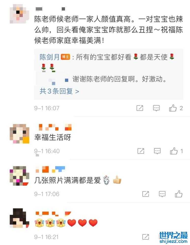 网友也十分喜欢陈剑月发的这一组日常,直言一家人颜值真高,还反调侃了自己的宝宝的颜值不够。不过陈剑月也大方回复道“所有的宝宝都好看,都是天使”。