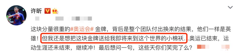 不久之前,东京奥运会结束以后,许昕在个人社交平台上发表示自己要将金牌送给自己即将来到这个世界的小棉袄,透露二胎宝宝即将出生,得到了网友们的祝福。