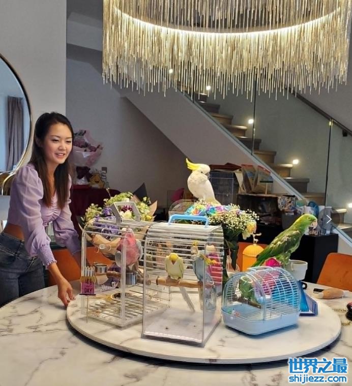 在之前陈庭欣晒出的照片中,大理石饭桌又大又圆,上面的灯饰富丽堂皇,饭桌上摆放着5只鹦鹉,还有两只鹦鹉并没有被关在笼子里。