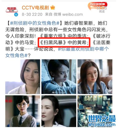 但是让人意外的是,即使大家看她出戏,她还是凭借这部剧被央视点名了。因为央视在社交平台上发起了一个话题,关于“刑侦局里的女性角色大家最喜欢哪一个”,其中有《重案六组》里的季洁、《破冰行动》里的马雯、《法医秦明》里的大宝以及现在热播的《扫黑风暴》中的黄希。