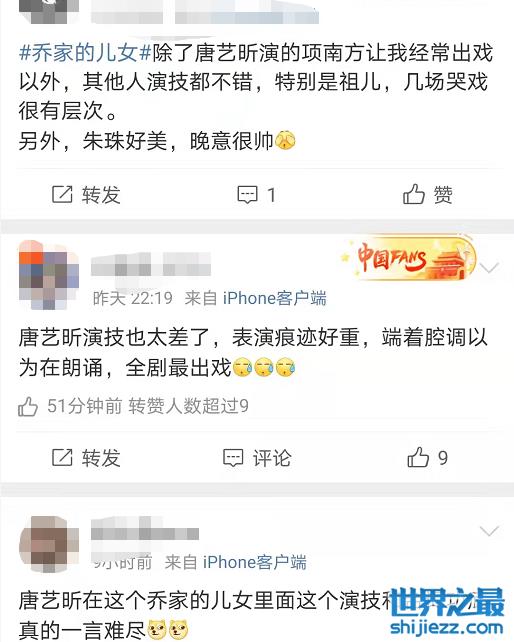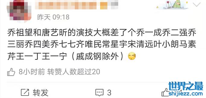 还有网友说,尤其唐艺昕和乔祖望站到一起对戏,他俩的演技中间差着乔一成乔二强乔三丽乔四美乔七七齐唯民……