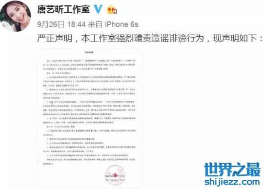 面对如此赤裸裸的诽谤,唐艺昕工作室直接甩出了声明。