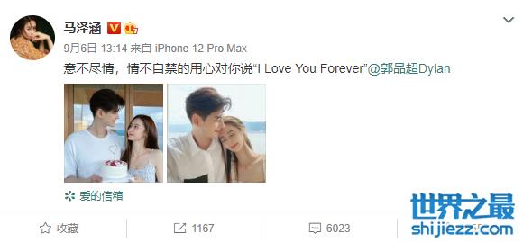 而且对于这次官宣俩人显然也都是花了些心思的,因为官宣那天是马泽涵的生日,时间还定在了13:14。官宣的照片里俩人手捧蛋糕深情对视,马泽涵倚在郭品超的怀里,对方一脸深情地看着她,让大家吃了一嘴的狗粮。