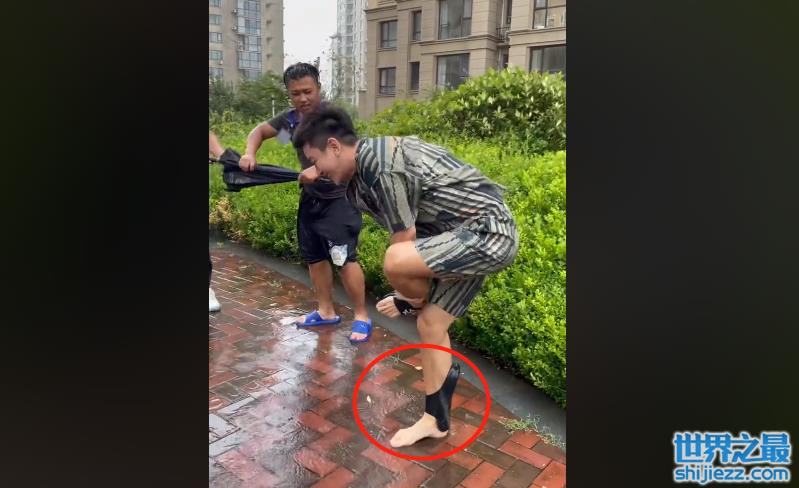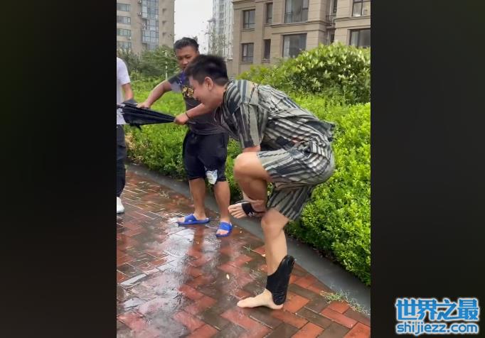 在追伞的过程中,路面湿滑,贾乃亮一不小心直接屁股着地,重重地摔在了地砖上,脚上穿着的塑料拖鞋还由于湿滑直接穿过脚踝到达了小腿根。