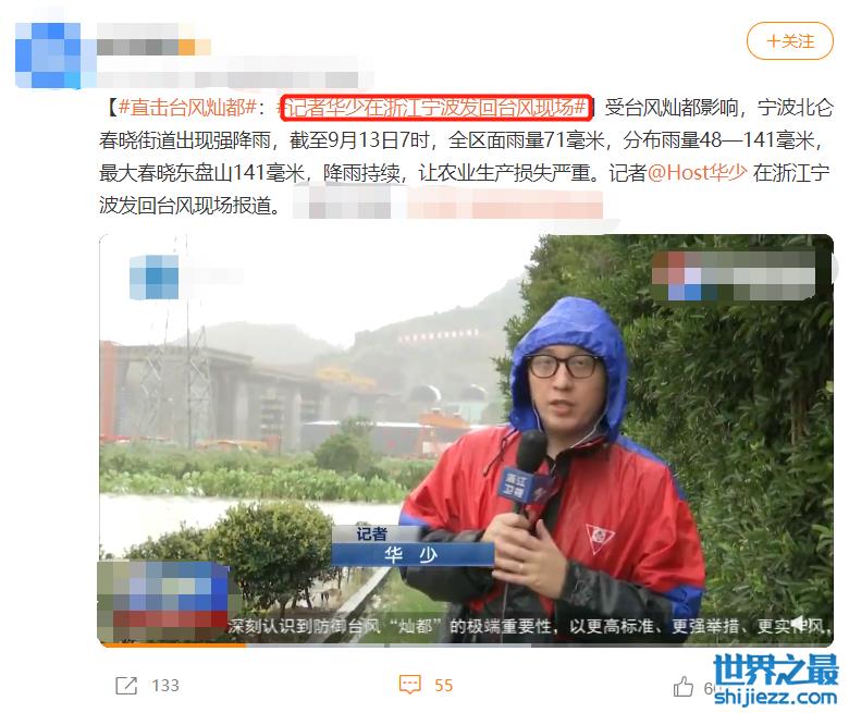 近日,在关于台风的新闻报道中,浙江台一哥华少作为记者现身台风受灾区现场,亲自感受并向大家讲解台风给该地区带来的危害与损失。