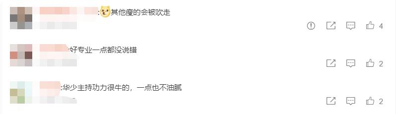 而网友们在听到华少的新闻报道之后,纷纷在评论区留言表示,华少的报道发音很是清晰,主持功底很好,讲解得十分专业,也有部分网友在评论区调侃,本是主持人的华少是因为身材较为壮硕不易被台风吹走才被拉过去做记者吗?