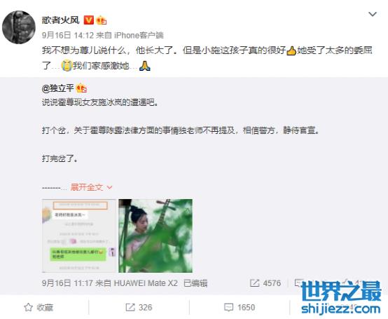 在网友爆料之后,霍尊的父亲火风还转发这篇文章,并在文案中写道“我不想为尊儿说什么,他长大了。但是小施这孩子真的很好,她受了太多的委屈了,我们全家感激她。” 如此看来,霍尊的父亲是非常认可霍尊的现任女友的。
