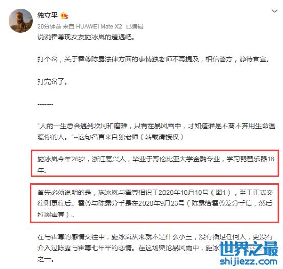 而最近,一位网名叫“独立平”的网友又跳出来发长文爆料,否认了网上所传霍尊现任女友施冰岚是“小三”的事情。据文中透露的消息显示,霍尊与施冰岚是去年10月10日才添加好友认识,而霍尊与陈露则是在9月23日正式分手的,所以这中间不存在“小三”之嫌。更是称施冰岚才是最大的受害者。