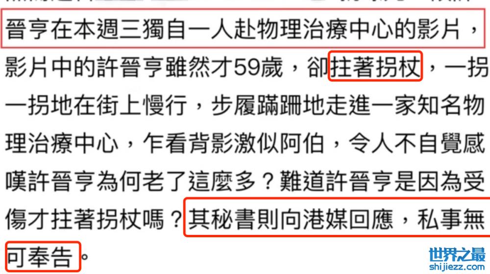 接受完治疗以后,许晋亨走出医院,他拄着拐杖慢慢地往前走去,不知道是不是因为生病。只见他的身体非常瘦弱,手腕和小腿都非常纤细。如今才59岁的许晋亨就已经用上了拐杖,让人十分担心他的身体状况。