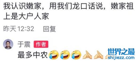 于震晒出这段在老家房顶上热舞的画面之后,得到了不少网友的评论。有龙口的网友称认识于震的老家,还说于震祖上是大户人家,于震面对该名网友的评论,显得很是谦虚,他回复这名网友说“最多中农”,对于祖上是大户人家的说法避重就轻地回应了。