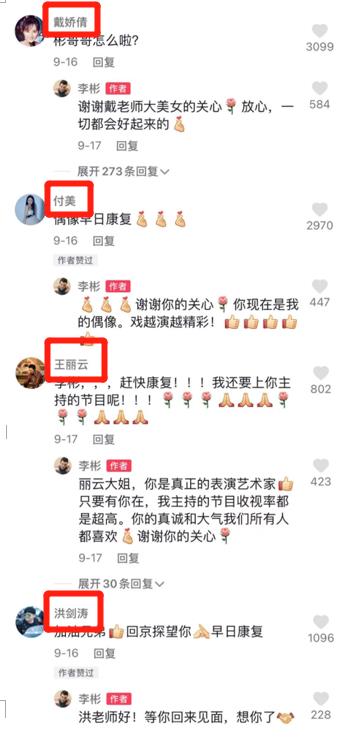 对于李斌生病住院,不少圈内好友,诸如洪剑涛,王丽云,戴娇倩等都纷纷送上祝福,希望早日可以去医院看望他,这也可见李斌在圈内的好人缘。