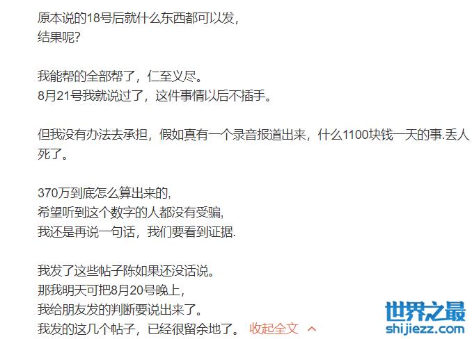 最令该博主很气愤的是,陈露一直拦着她不让她发帖,说这是为她好,是在保护她,这就令人很无语了,明明是该博主分文都没有收陈露的,还一直为陈露发声,最终反而她成了被保护的人,这不讲道理还在道德制高点的感觉,真的让人很不爽,该博主希望能够得到陈露的解释,不然会曝光更让人生气的料,为陈露还保留着做人的底线。