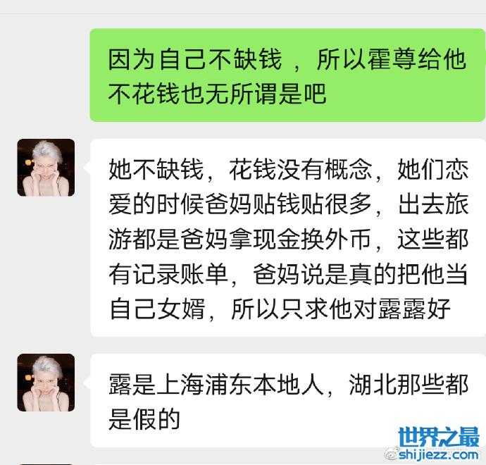 陈露透露自己的家境曾是当地首富,还在上海浦东区,那的确是非常有钱了,而此前霍尊聊天记录曝光,曾直言与陈露家门不当户不对,与陈露的父母思想也不在一个层次上,这又是谁在说谎呢?另外,两人分手闹掰后,网友曾扒出陈露经营的舞蹈室,只是一个非常小型的舞蹈室,而且陈露的收入也很一般,如果真的像陈露所言如此有钱,那么为何去找霍尊还是打车去呢?还要找霍尊报销车费呢?自己还要省吃俭用穿二三百元的便宜货呢?显然,陈露家条件优越这里说谎了吧。