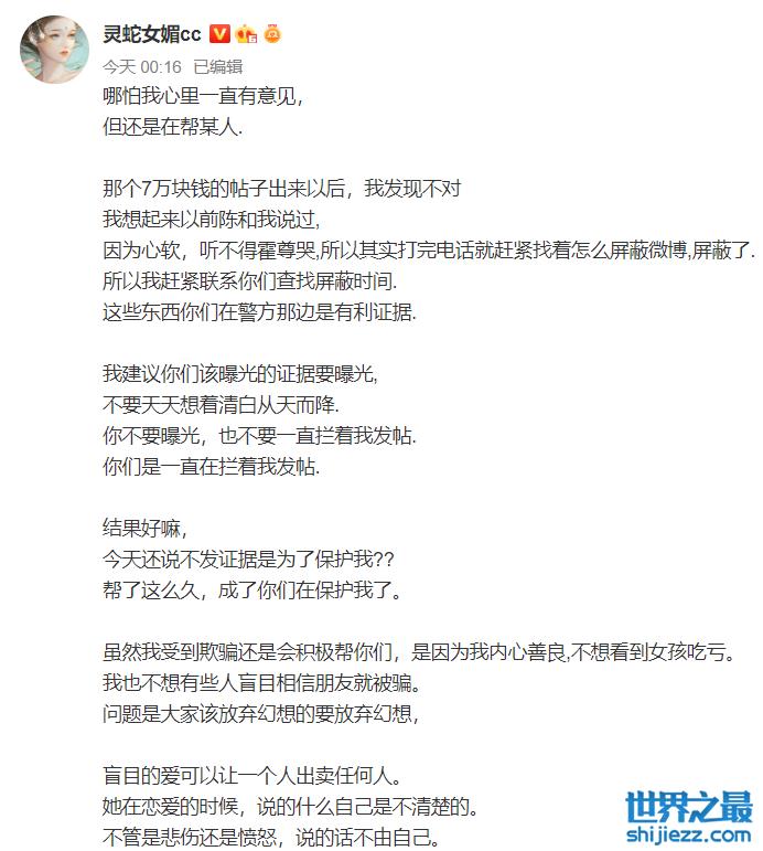另外,博主“灵蛇”透露陈露同她讲的与爆料的完全不一样,不明白如果这些爆料都不是事实,为什么不去反驳,反而让她遭受了很多舆论非议,也认为她与霍尊方总有一个是撒谎的,如果陈露同她讲的都是谎话,陈露同样也承担法律责任,该博主有意将问题抛到了陈露这边,试图将自己从此事中脱离出来,毕竟此事已经立案,她或许会因为陈露发声而连带责任。