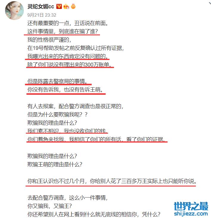 博主“灵蛇”将与王萌的聊天记录以及关于300万证据迟迟未看到的动态发出去后,并非得到陈露的回应与解释,而后她又继续放料似乎要与陈露互撕。