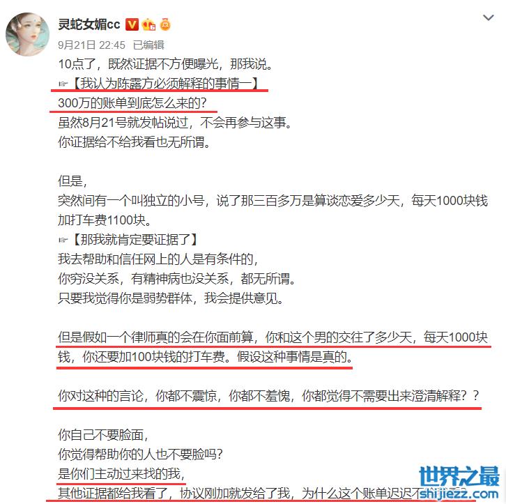 该博主灵蛇直言她认为陈露方必须解释300万的账单到底怎么来的,是不是如她所言恋爱期间为霍尊花了两三百万,还是如另一位博主“独立平”爆料的那样,每天1000块钱加上打车费1100块,如果真的是这样算下来的300万,该博主觉得帮助陈露会很羞愧,她也感到很震惊,需要陈露出来澄清解释,另外她直言,是陈露主动找到的她,所有的证据都给她看了,包括陈露与霍尊签的协议,可唯独这个账单迟迟不发给她。