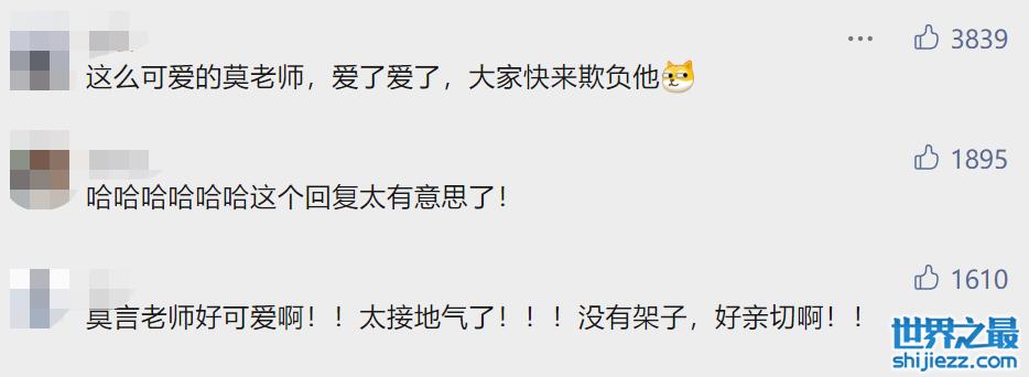 网友们看到这些内容之后,都感受到了莫言的亲切与可爱,评论他的回复太有意思了。