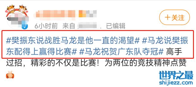而樊振东也在采访中回应称:“战胜马龙一直是我的渴望”。