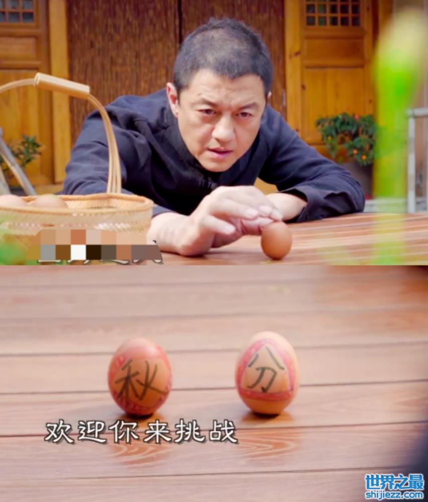 吃完饭后,李亚鹏拿出了一箩筐的鸡蛋开始玩起了游戏,只见他紧盯着手上的鸡蛋,目不转睛非常认真。因为地理原因,李亚鹏很快就将画有“秋分”两个字样的鸡蛋竖了起来。