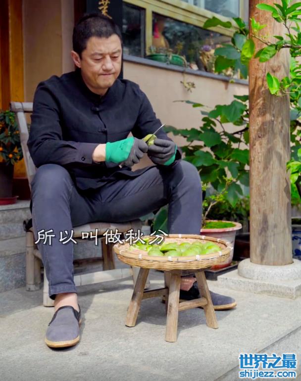 李亚鹏坐在门口前的木凳上,手上戴着黑色的橡胶手套拿着小刀正在处理面前的青皮核桃,手起刀落动作非常娴熟。在剥核桃的同时,李亚鹏还非常亲切地科普了秋分的来源,十分具有教育意义。