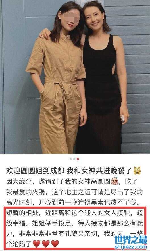 除此之外,还有一位网友晒出和高圆圆的合照,称:“。短暂的相处,近距离和这个迷人的女人接触,超级幸福。姐姐举手投足,待人接物都是那么有魅力,非常非常非常有礼貌又亲切,我的天,一整个沦陷了”。