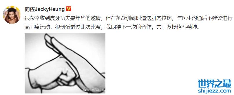 9月25日,向佐突然发布微博,宣布退赛。向佐在微博中先是感谢了虎牙功夫嘉年华的邀请,然后解释了退赛的原因,原来他在备战训练时肌肉拉伤,医生不建议他进行高强度的运动,因为健康原因所以才退赛的,并表示期待下一次的合作。