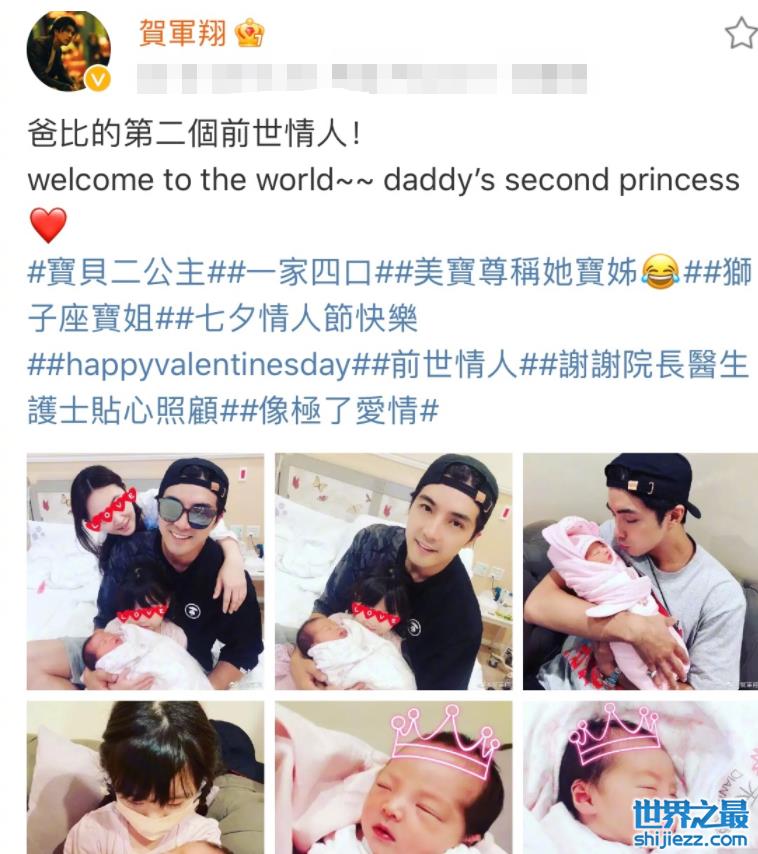 据悉,贺军翔目前共有两个女儿,在二女儿出生的时候,贺军翔还特意在社交平台发文表示对二女儿降生的喜悦,还称二女儿是他前世的第二个小情人,一家人看起来幸福又温馨。与他此番采访说出来的迷惑发言反差极大。