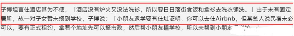 生活上不方便还能慢慢适应,最让林子博头疼的可能是林子博的一对子女至今无法在国外找到学校上学。因为林子博没有工作,所以找不到房子住,也因为没有住房地址,所以无法入读学校。