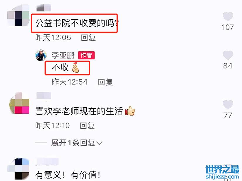 关于网友们所提书院的收费问题,李亚鹏回答道:“不收”。粉丝们纷纷夸赞李亚鹏的公益项目,很有意义和价值。