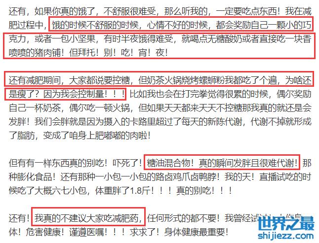 另外就是大家一直说控糖,张大大告诫大家一定不要吃糖油混合物,但是像奶茶火锅烧烤螺蛳粉什么的,他都吃了,但是他控制了量,所以也一直在瘦。另外就是千万不要吃减肥药,他曾经试过,太伤身体了。