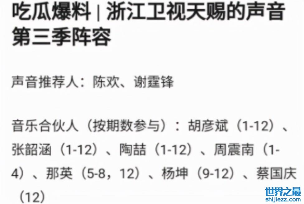 再是《天赐的声音3》,从网上公布的嘉宾名单可以看出,除了常驻外,仅仅是飞行嘉宾就有几十位。虽说只是拟邀,官方还没有暂时定下,但是也让不少网友惊叹节目组的大手笔。因为第二季的口碑严重下滑,所以很多网友都猜测节目组希望通过嘉宾来挽回口碑。