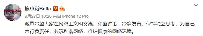 另外,霍尊的现女友施冰岚也在27日发声,她恳请大家文明交流,冷静发言,保持独立的思考,也对自己的言行负责,希望共建和谐网络。
