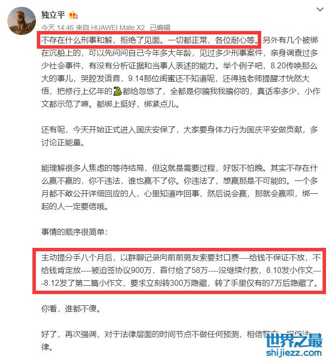 在28日当天,独立平还曾发布了动态,他直言霍尊不会选择和解,也拒绝与陈露见面,一切都正常,也请网友耐心等待,另外独立平还将霍尊一事又简单说了一遍经过,最后他不做任何预测,等待最终的结果,从他的语气中能够感受到,霍尊这边的底气确实很足。
